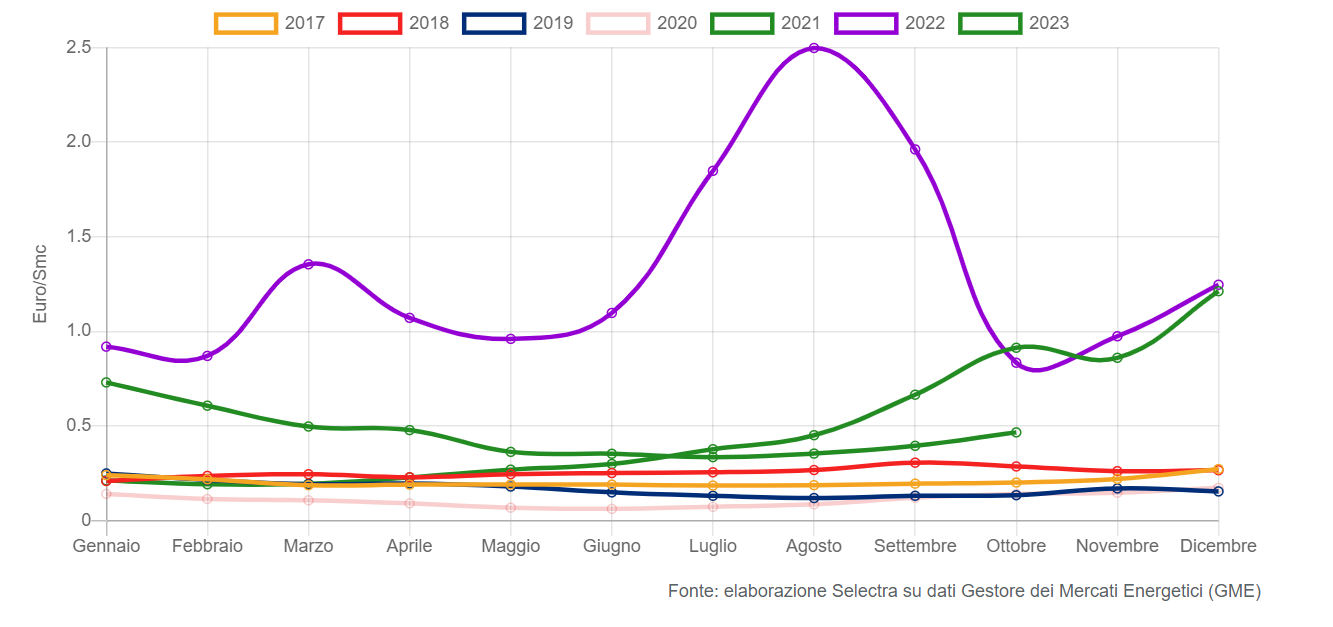 Grafico: Andamento del prezzo del gas al PSV negli ultimi anni