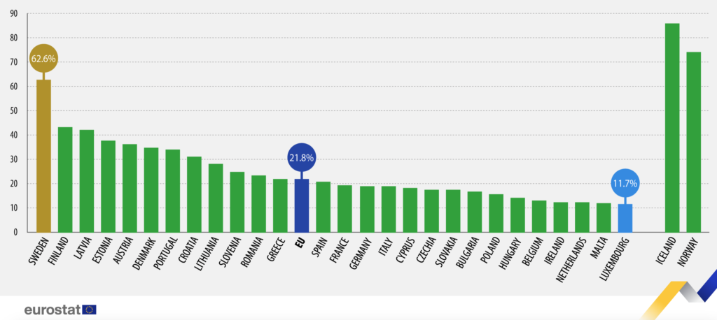 Grafico: Quota di energia da fonti rinnovabile nell’Unione Europea, 2021 (% per paese)